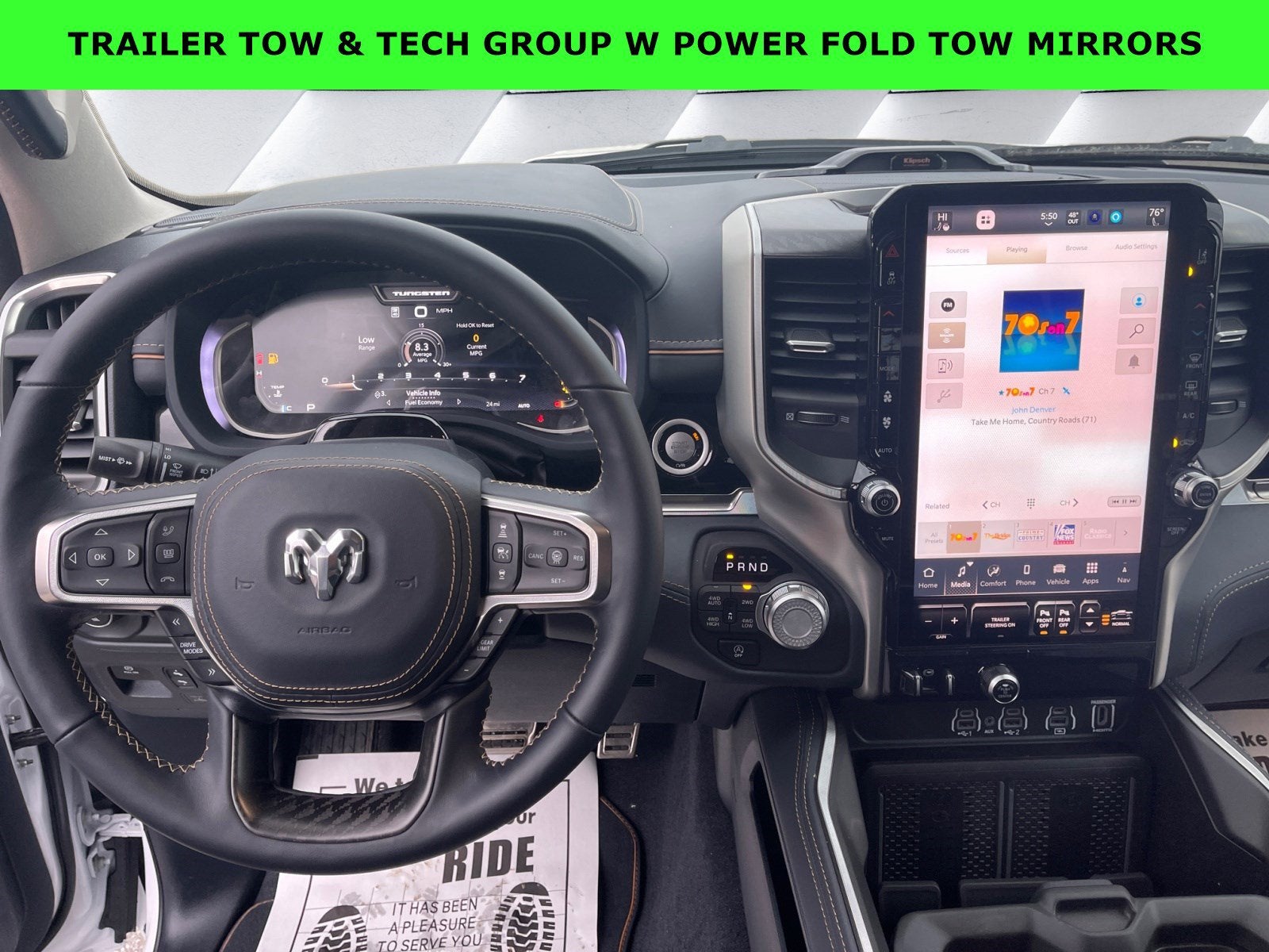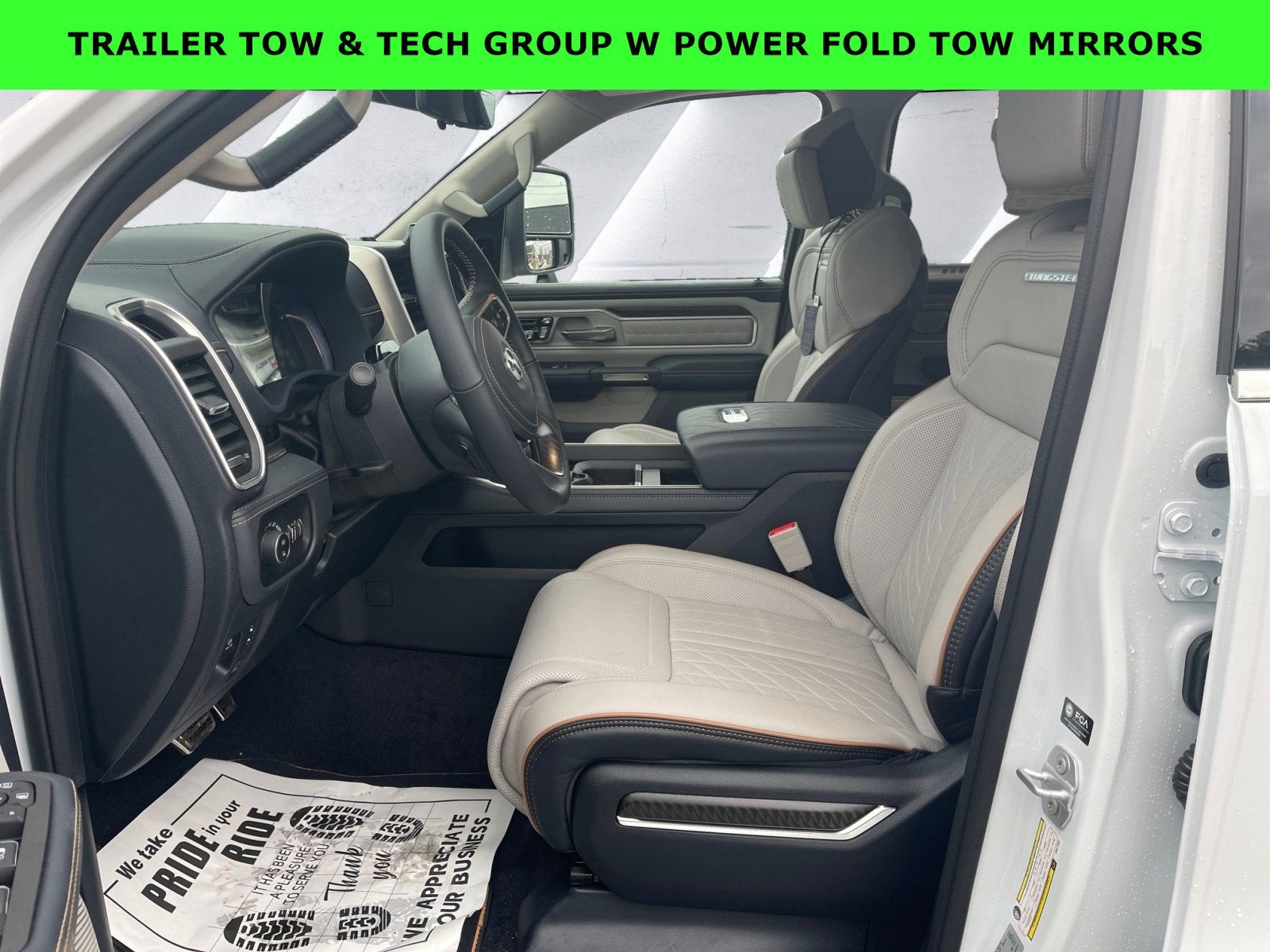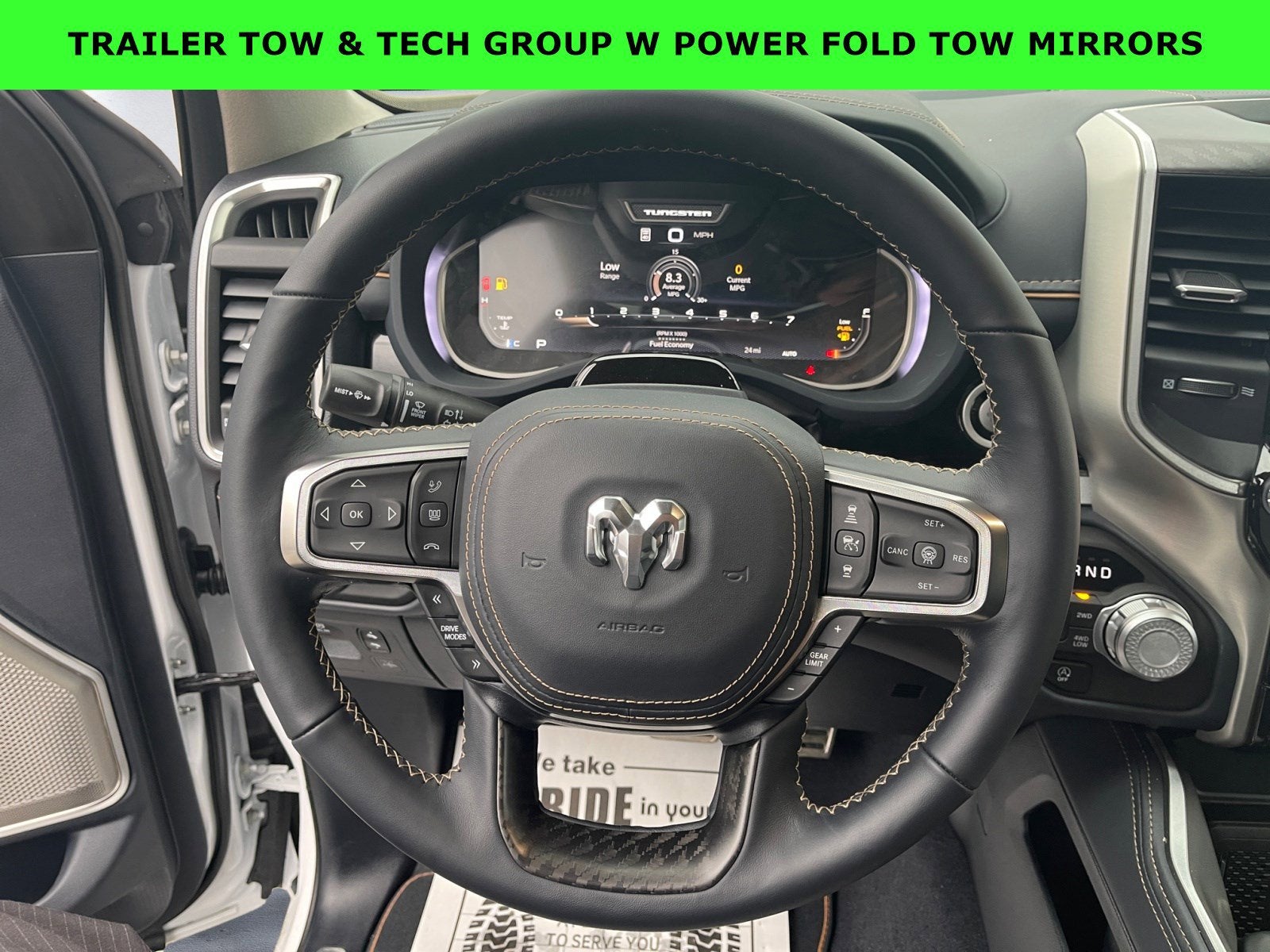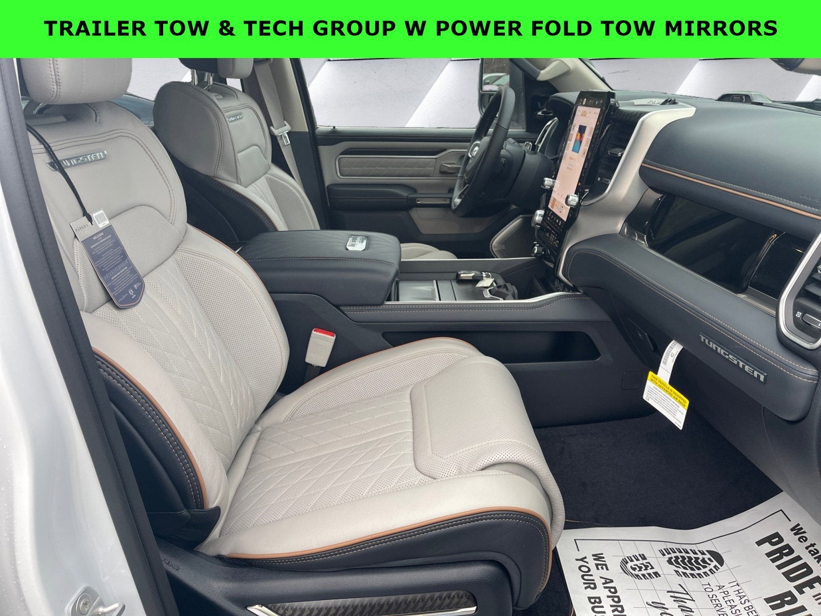 Featured Equipment: 1500 Tungsten, 4D Crew Cab, 3.0L I6, 8-Speed Automatic, 4WD, Bright White Clearcoat, Sea Salt/Bison Brown w/Leather Trimmed Bucket Seats, 12-Way/1-Way Trailer Connector, Alloy wheels, AM/FM radio: SiriusXM with 360L, Apple CarPlay/Android Auto, Auto High-beam Headlights, Auto Power-Folding Mirrors, Auto-leveling suspension, Brake assist, Delay-off headlights, Digital 3.0 Rear View Auto Dim Mirror, Electronic Stability Control, Front fog lights, Fully automatic headlights, Heads-Up Display, Heated front seats, Heated rear seats, Heated steering wheel, Navigation System, Power driver seat, Power moonroof, Power passenger seat, Power Telescoping Mirrors, Quick Order Package 22V Tungsten, Radio: Uconnect 5 Nav w/14.4 Display, Rain sensing wipers, Towing Technology Group, Trailer Brake Control, Trailer Hitch Line-Up Assist, Trailer Light Check, Trailer Reverse Guidance, Trailer Reverse Steering Control, Trailer Tire Pressure Monitoring System, Trailer Tow Group, Trailer Tow Mirrors, Ventilated front seats, Ventilated rear seats, Wheels: 22 x 9 Polish/Painted w/Inserts.